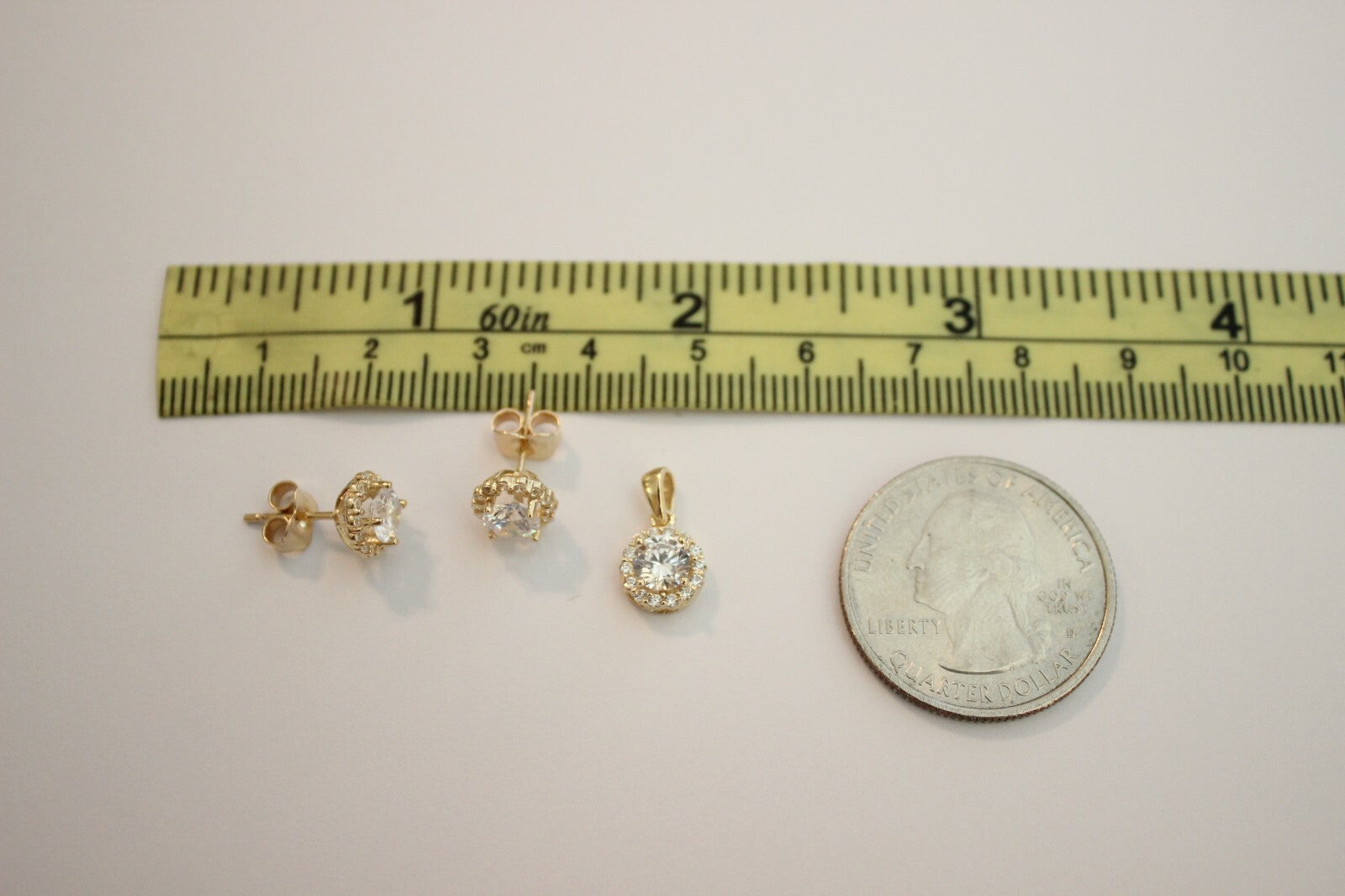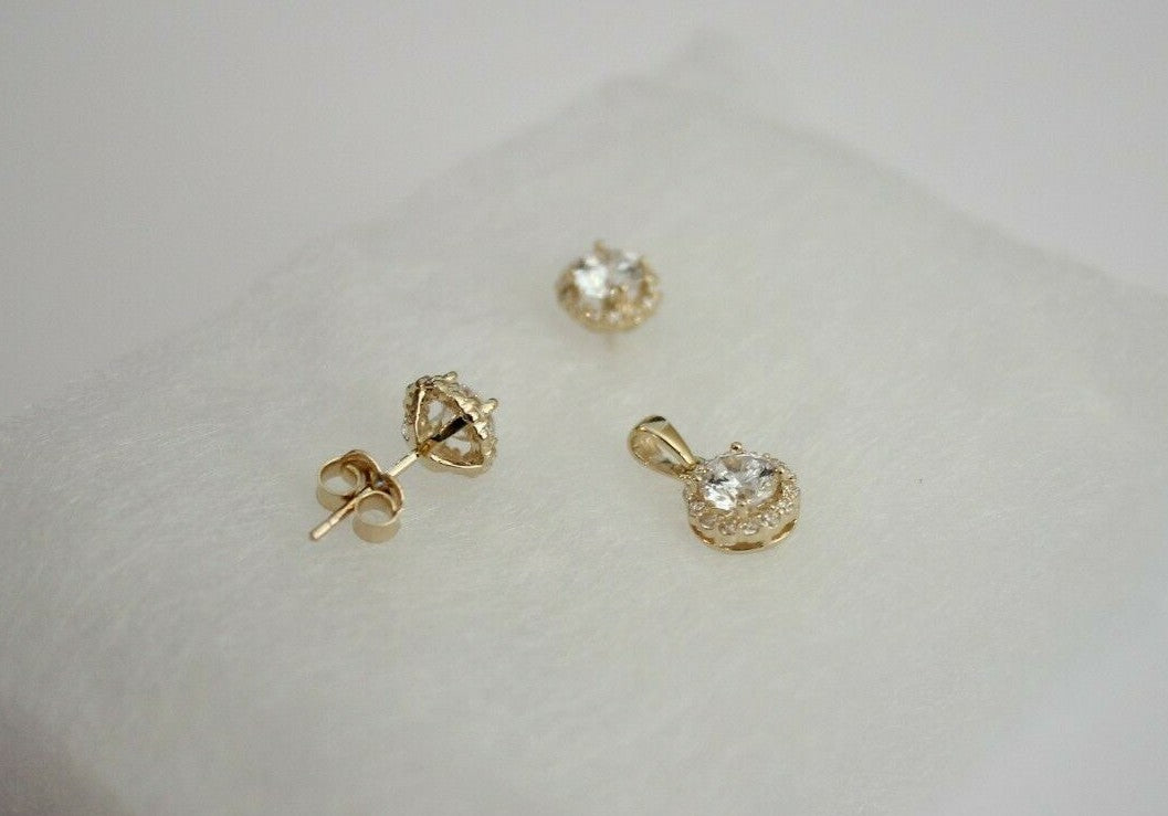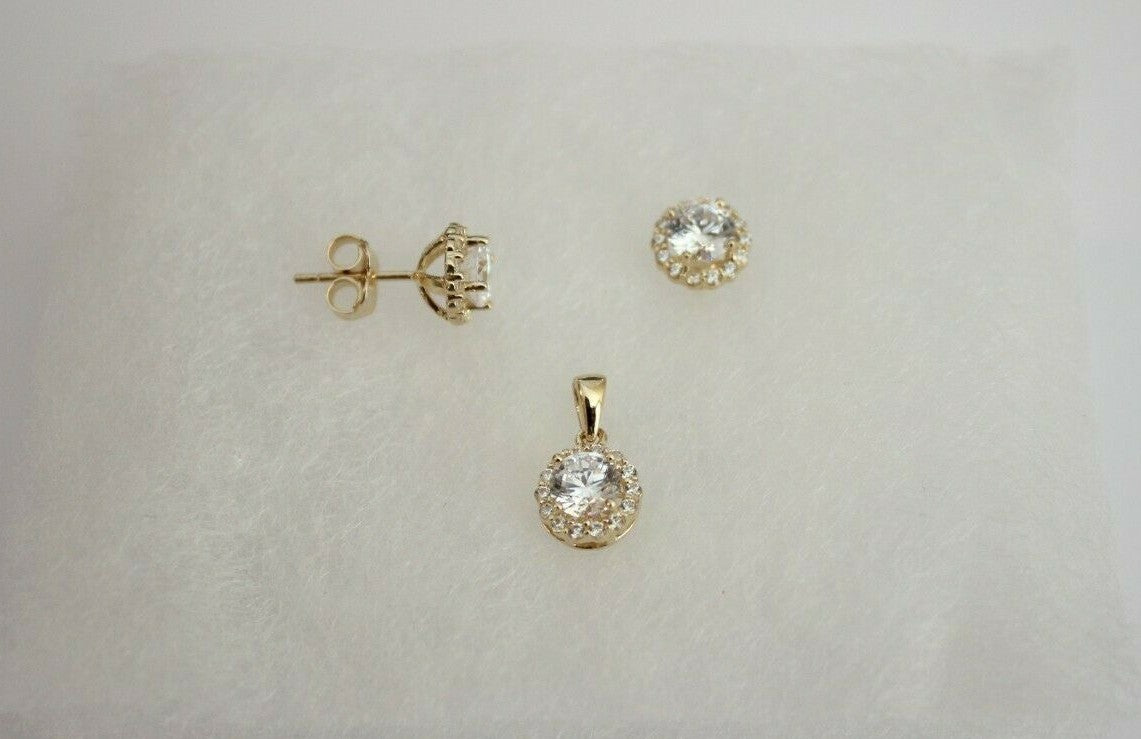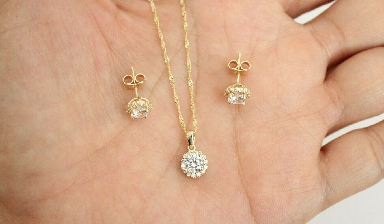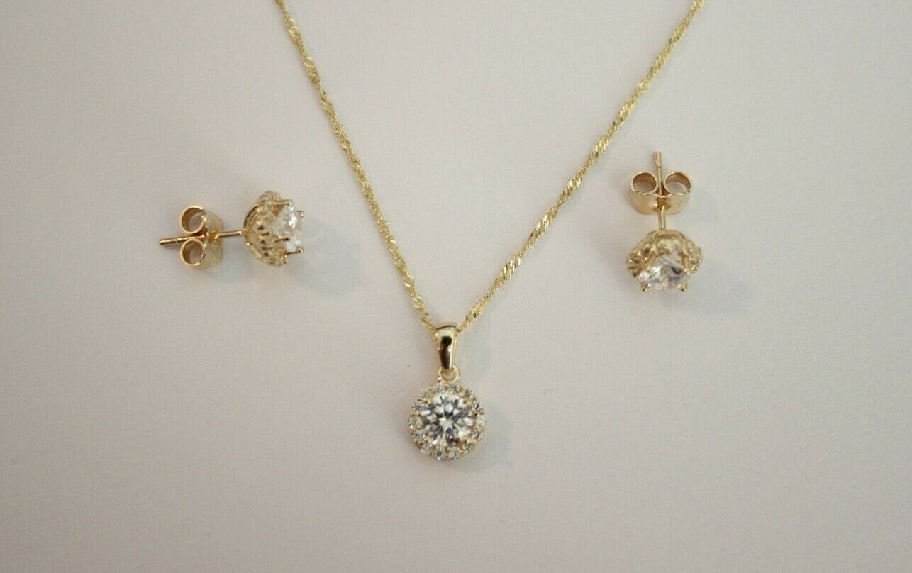 Type: Round Solitaire with CZ Charm Pendant And/Or Earrings And/Or Singapore Chain, stamped with 14K for Metal Purity.