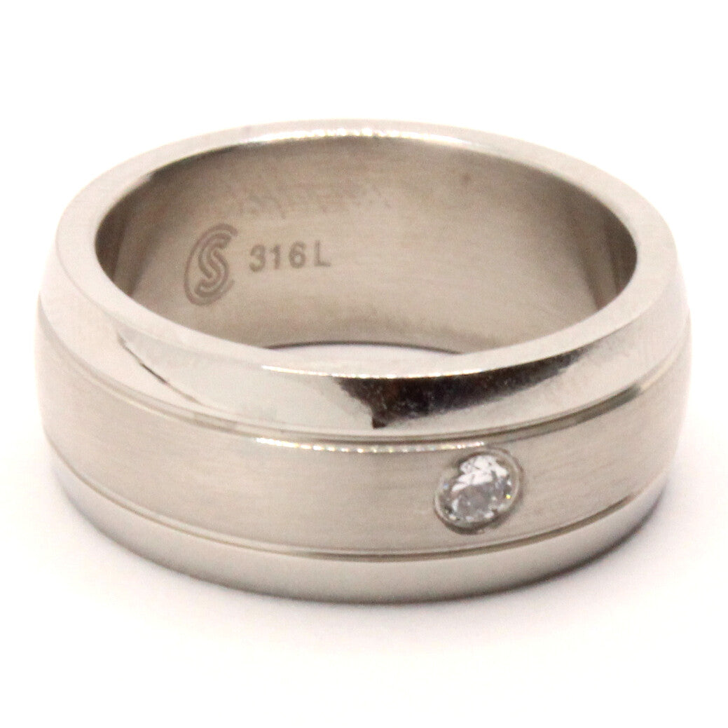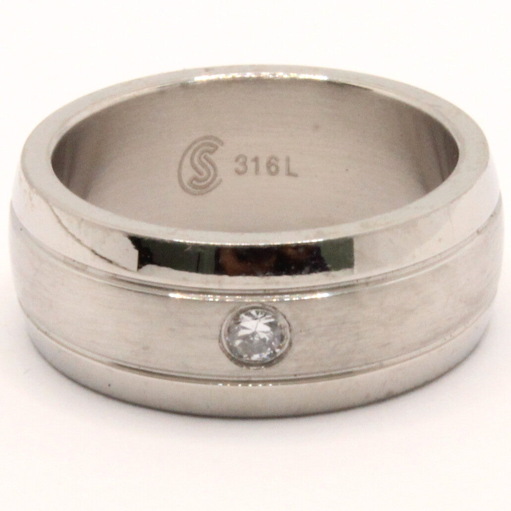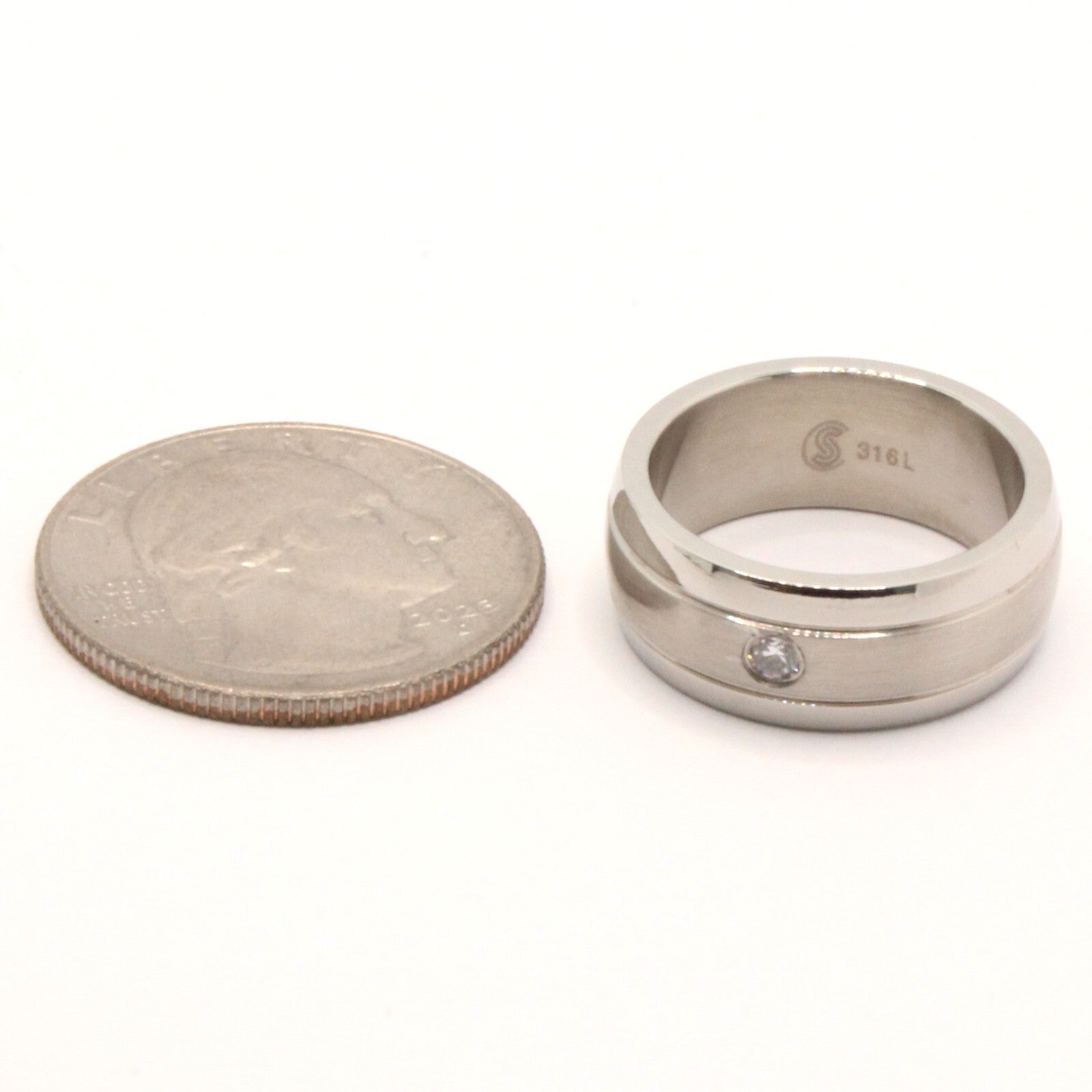 Stainless Steel Domed Two Grooves Matte Center with CZ Wedding Band Ring 8mm